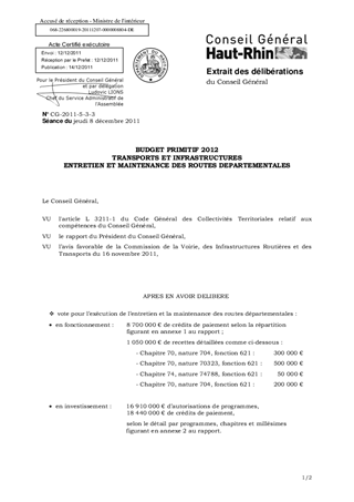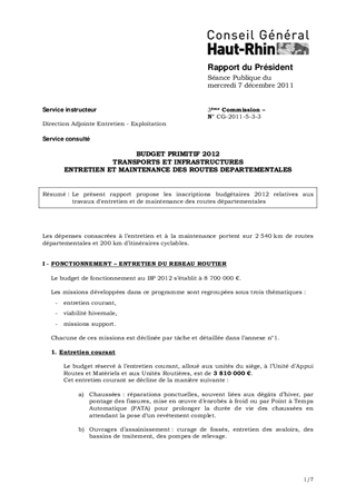 BUDGET PRIMITIF 2012 TRANSPORTS ET INFRASTRUCTURES ENTRETIEN ET MAINTENANCE DES ROUTES DEPARTEMENTALES