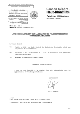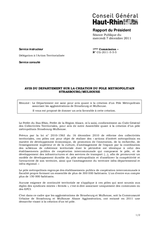 AVIS DU DEPARTEMENT SUR LA CREATION DU POLE METROPOLITAIN STRASBOURG/MULHOUSE