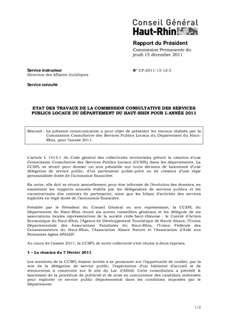 La présente communication a pour objet de présenter les travaux réalisés par la Commission Consultative des Services Publics Locaux du Département du Haut-Rhin, pour l'année 2011.