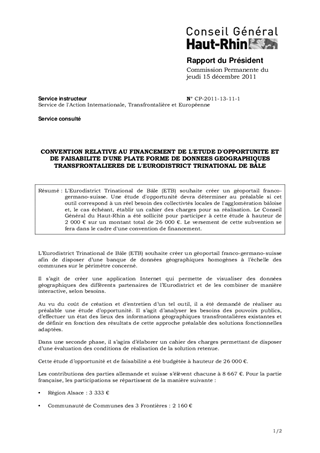 CONVENTION RELATIVE AU FINANCEMENT DE L'ETUDE D'OPPORTUNITE ET DE FAISABILITE D'UNE PLATE FORME DE DONNEES GEOGRAPHIQUES TRANSFRONTALIERES DE L'EURODISTRICT TRINATIONAL DE BÂLE