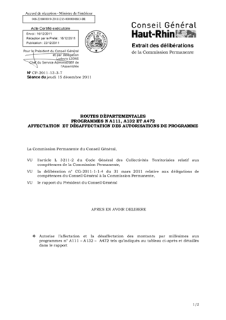 ROUTES DÉPARTEMENTALES PROGRAMMES N A111, A132 ET A472 AFFECTATION ET DÉSAFFECTATION DES AUTORISATIONS DE PROGRAMME