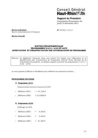 Le Règlement Financier dans son article 9.6 stipule que l’affectation et la désaffectation des Autorisations de Programme relèvent d’une décision de la Commission Permanente. Le présent rapport concerne les programmes n° A111 – A132 - A472.