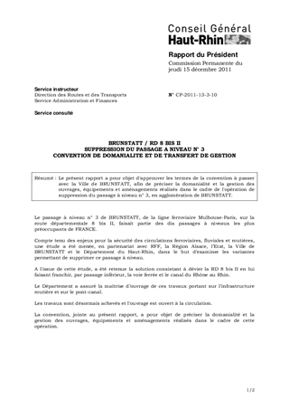 Le présent rapport a pour objet d'approuver les termes de la convention à passer avec la Ville de BRUNSTATT, afin de préciser la domanialité et la gestion des ouvrages, équipements et aménagements réalisés dans le cadre de l'opération de suppression du passage à niveau n° 3, en agglomération de BRUNSTATT.