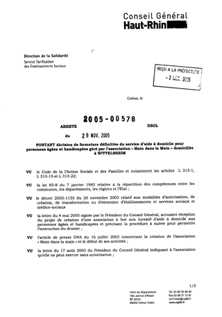 portant décision de fermeture définitive du service d'aide à domicile pour personnes âgées et handicapées géré par l'association "Main dans la main" domiciliée à WITTELSHEIM. Resumé Pièces jointes ARRETE Assemblée : Non défini Date : 29/11/2005 Rapporteur : Non défini Collectivité : Conseil départemental du Haut-Rhin Direction : Non défini Service : Service de la Tarification des Etablissements Domaine : Autres (non classés) Commission :