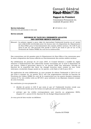 Le présent rapport a pour objet de réactualiser l’indemnité locative au m² versée aux collectivités territoriales pour les locaux mis à la disposition du Département du Haut-Rhin pour le fonctionnement des centres médico-sociaux. De 3,66 € par mois et par m², elle pourrait être portée à 3,84 € par mois et par m² au vu de l’évolution de l’indice INSEE du coût de la construction.