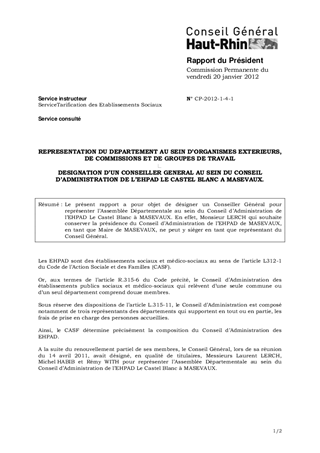 Le présent rapport a pour objet de désigner un Conseiller Général pour représenter l’Assemblée Départementale au sein du Conseil d’Administration de l’EHPAD Le Castel Blanc à MASEVAUX. En effet, Monsieur LERCH qui souhaite conserver la présidence du Conseil d’Administration de l’EHPAD de MASEVAUX, en tant que Maire de MASEVAUX, ne peut y siéger en tant que représentant du Conseil Général.