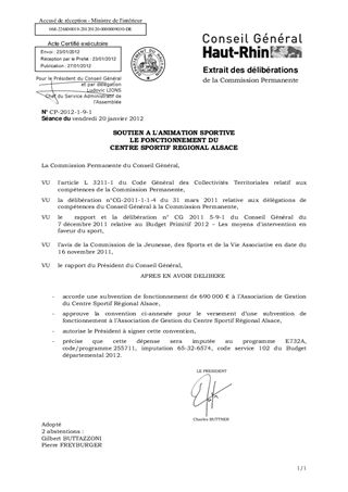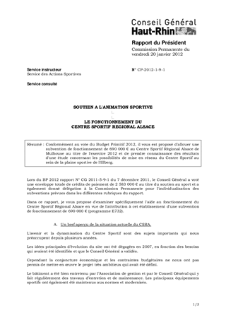 Conformément au vote du Budget Primitif 2012, il vous est proposé d'allouer une subvention de fonctionnement de 690 000 € au Centre Sportif Régional Alsace de Mulhouse au titre de l'exercice 2012 et de prendre connaissance des résultats d'une étude concernant les possibilités de mise en réseau du Centre Sportif au sein de la plaine sportive de l'Illberg.
