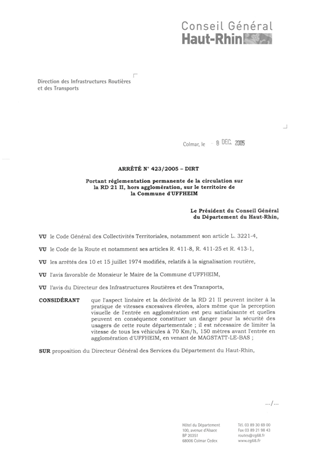 portant réglementation permanente de la circulation sur la RD 21 II, hors agglomération, sur le territoire de la commune d'UFFHEIM. Resumé Pièces jointes ARRETE Assemblée : Non défini Date : 08/12/2005 Rapporteur : Non défini Collectivité : Conseil départemental du Haut-Rhin Direction : Non défini Service : Direction des Routes Domaine : Circulation Commission :