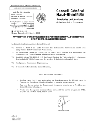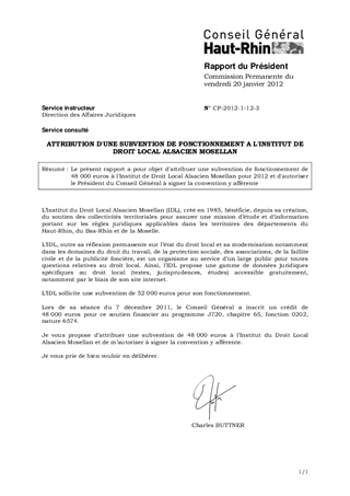 Le présent rapport a pour objet d'attribuer une subvention de fonctionnement de 48 000 euros à l'Institut de Droit Local Alsacien Mosellan pour 2012 et d'autoriser le Président du Conseil Général à signer la convention y afférente