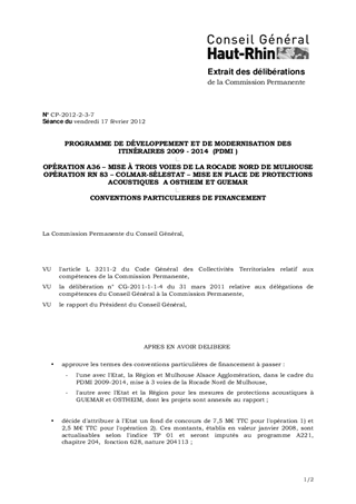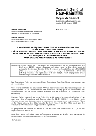 PROGRAMME DE DÉVELOPPEMENT ET DE MODERNISATION DES ITINÉRAIRES 2009 - 2014 (PDMI ) OPÉRATION A36 – MISE À TROIS VOIES DE LA ROCADE NORD DE MULHOUSE OPÉRATION RN 83 – COLMAR-SÉLESTAT – MISE EN PLACE DE PROTECTIONS ACOUSTIQUES A OSTHEIM ET GUEMAR CONVENTIONS PARTICULIERES DE FINANCEMENT