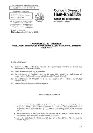 Le présent rapport a pour objet d'une part de transférer 2 000 000 € d'AP sur le Programme A132 "Calibrage" – millésime 2012. D'autre part, il a pour but d'approuver une liste d'opérations de Sécurité en Traverse d’Agglomération à retenir pour l'année 2012.