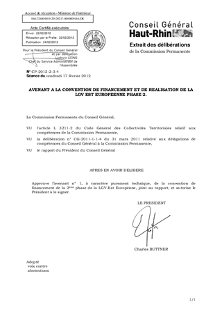 AVENANT A LA CONVENTION DE FINANCEMENT ET DE REALISATION DE LA LGV EST EUROPEENNE PHASE 2.
