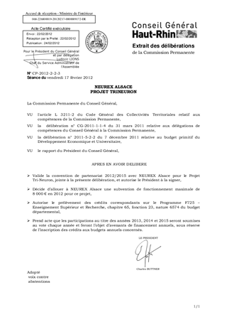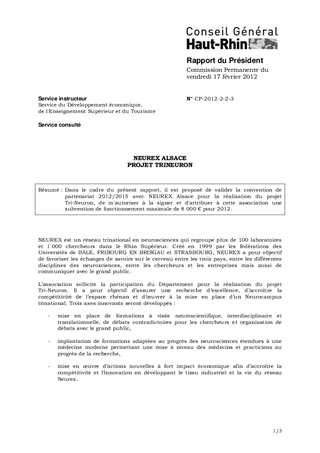 Dans le cadre du présent rapport, il est proposé de valider la convention de partenariat 2012/2015 avec NEUREX Alsace pour la réalisation du projet Tri-Neuron, de m'autoriser à la signer et d'attribuer à cette association une subvention de fonctionnement maximale de 8 000 € pour 2012.