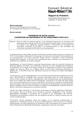 UNIVERSITE DE HAUTE ALSACE CONVENTION DE PARTENARIAT ET DE FINANCEMENT POUR 2012