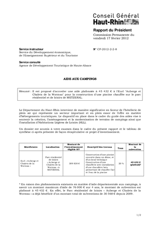 Il est proposé d'accorder une aide plafonnée à 45 432 € à l'Eurl "Auberge et Chalets de la Wormsa" pour la construction d'une piscine chauffée sur le parc résidentiel et de loisirs de METZERAL.