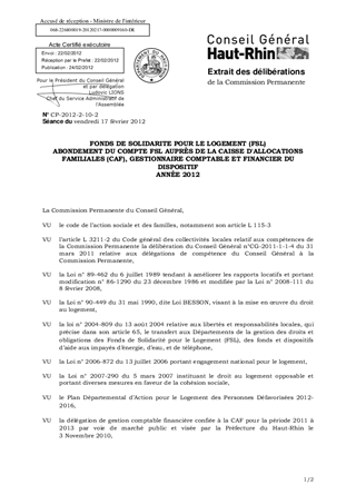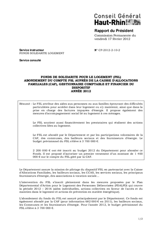 FONDS DE SOLIDARITE POUR LE LOGEMENT (FSL) ABONDEMENT DU COMPTE FSL AUPRÈS DE LA CAISSE D'ALLOCATIONS FAMILIALES (CAF), GESTIONNAIRE COMPTABLE ET FINANCIER DU DISPOSITIF ANNÉE 2012