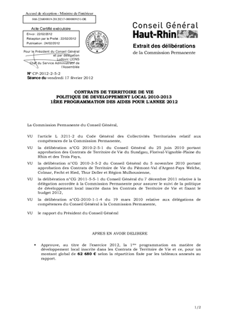 Programmation définitive, au titre de l'exercice 2012, d'opérations de développement local retenues dans le cadre de l'appel à projets 2011, telles qu'elles figurent en annexe du rapport pour un montant global de 62 680 € et qui concernent les Territoires de Vie du Sundgau, Thur Doller, Piémont Val d'Argent Pays Welche, Florival Vignoble Plaine du Rhin et Trois Pays.
