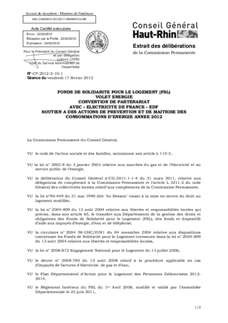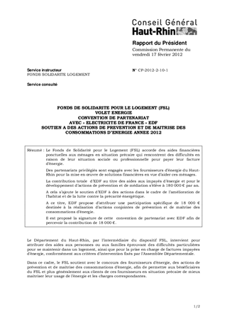 FONDS DE SOLIDARITE POUR LE LOGEMENT (FSL) VOLET ENERGIE CONVENTION DE PARTENARIAT AVEC « ELECTRICITE DE FRANCE » EDF SOUTIEN A DES ACTIONS DE PREVENTION ET DE MAITRISE DES CONSOMMATIONS D’ENERGIE ANNEE 2012