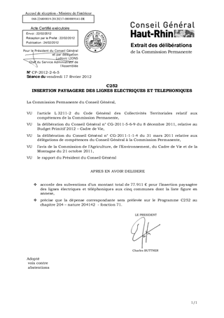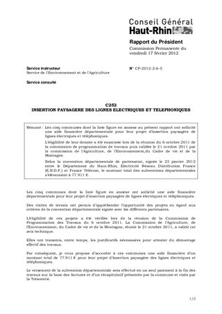 Les cinq communes dont la liste figure en annexe au présent rapport ont sollicité une aide financière départementale pour leur projet d’insertion paysagère de lignes électriques et téléphoniques. L’éligibilité de leur dossier a été examinée lors de la réunion du 6 octobre 2011 de la commission de programmation de travaux puis validée le 21 octobre 2011 par la commission de l’Agriculture, de l’Environnement,du Cadre de vie et de la Montagne. Selon la convention départementale de partenariat, signée le 23 janvier 2012 entre le Département du Haut-Rhin, Electricité Réseau Distribution France (E.R.D.F.) et France Télécom, le montant total des subventions départementales s’élèveraient à 77.911 €.