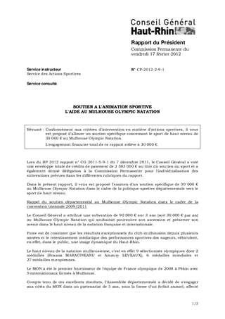 Conformément aux critères d'intervention en matière d'actions sportives, il vous est proposé d'allouer un soutien spécifique concernant le sport de haut niveau de 30 000 € au Mulhouse Olympic Natation. L'engagement financier total de ce rapport s'élève à 30 000 €.