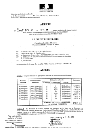 portant application du régime forestier à des parcelles appartenant au Conseil Général du Haut-Rhin sises sur le territoire communal de WINTZENHEIM. Resumé Pièces jointes ARRETE Assemblée : Non défini Date : 15/12/2005 Rapporteur : Non défini Collectivité : Conseil départemental du Haut-Rhin Direction : Non défini Service : Service du Patrimoine et du droit des Sols Domaine : Autres (non classés) Commission :