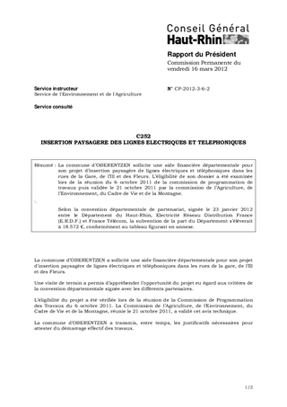 La commune d’OBERENTZEN sollicite une aide financière départementale pour son projet d’insertion paysagère de lignes électriques et téléphoniques dans les rues de la Gare, de l’Ill et des Fleurs. L’éligibilité de son dossier a été examinée lors de la réunion du 6 octobre 2011 de la commission de programmation de travaux puis validée le 21 octobre 2011 par la commission de l’Agriculture, de l’Environnement, du Cadre de Vie et de la Montagne. Selon la convention départementale de partenariat, signée le 23 janvier 2012 entre le Département du Haut-Rhin, Electricité Réseau Distribution France (E.R.D.F.) et France Télécom, la subvention de la part du Département s’élèverait à 18.572 €, conformément au tableau figurant en annexe.