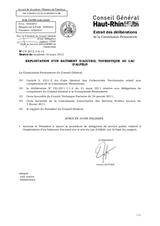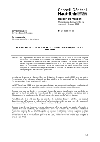 Le Département souhaite réhabiliter l’auberge du lac d’Alfeld. Il vous est proposé de confier l’exploitation du bâtiment à un professionnel de la restauration par voie de Délégation de Service Public. Les prestations de cette DSP seront identiques à celles adoptées en Commission Permanente le 13 mai 2011, qui n’a pas abouti faute de candidats crédibles, mais les conditions de cette délégation seront adaptées à l’ancienne auberge réhabilitée et offriront un contexte économique plus attrayant pour les candidats potentiels.