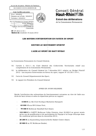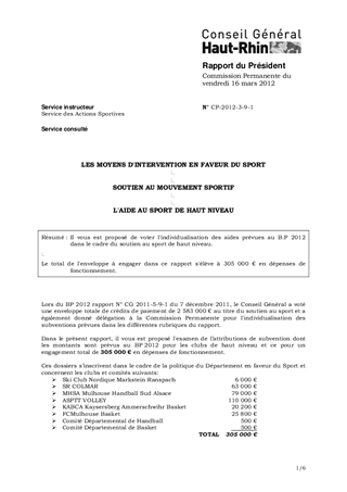 Il vous est proposé de voter l'individualisation des aides prévues au B.P 2012 dans le cadre du soutien au sport de haut niveau. Le total de l'enveloppe à engager dans ce rapport s'élève à 305 000 € en dépenses de fonctionnement.