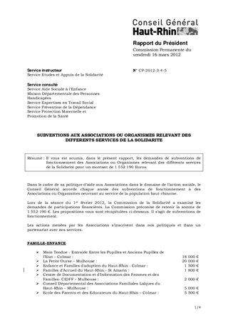 Il vous est soumis, dans le présent rapport, les demandes de subventions de fonctionnement des Associations ou Organismes relevant des différents services de la Solidarité pour un montant de 1 552 190 Euros.