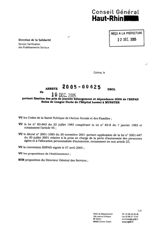 portant fixation des prix de journée hébergement et dépendance 2006 de l'EHPAD soins de longue durée de l'hôpital Loewel à MUNSTER. Resumé Pièces jointes ARRETE Assemblée : Non défini Date : 19/12/2005 Rapporteur : Non défini Collectivité : Conseil départemental du Haut-Rhin Direction : Non défini Service : Service de la Tarification des Etablissements Domaine : Prix de Journée Commission :