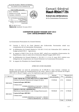 Lors du BP 2007, l’Assemblée Départementale a souhaité poursuivre son soutien à l’agriculture de montagne à travers la convention Massif Vosgien 2007 2013 liant les trois collectivités alsaciennes. Dans ce cadre, il vous est proposé de vous prononcer sur deux dossiers représentant un total de 21.584,86 € de subvention pour la création ou l’amélioration de locaux de transformation et de vente.