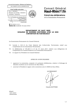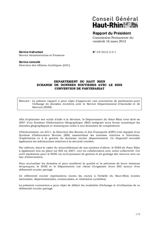 DEPARTEMENT DU HAUT RHIN ECHANGE DE DONNEES ROUTIERES AVEC LE SDIS CONVENTION DE PARTENARIAT