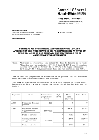 Attribution de subventions aux collectivités dans le domaine de la voirie. Affectation pour un montant de 627 526€, dont 32 197 € pour 2 opérations inscrites au Contrats de Territoire de Vie (C.T.V.) de la Région Mulhousienne et de Colmar, Fecht et Ried, et annulation d'une aide d'un montant de 332 054 €.