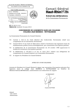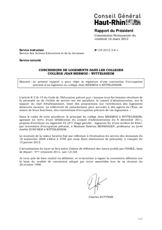 Le présent rapport a pour objet la signature d'une convention d'occupation précaire d'un logement au collège Jean MERMOZ à WITTELSHEIM.