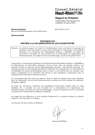 Le présent rapport est relatif à l’établissement d’une convention de partage de données à titre non onéreux, entre notre collectivité et l’association « Groupement d’Etudes et de Protection des Mammifères d’Alsace » (GEPMA). Ce projet de convention a recueilli un avis favorable de la Commission de l'Agriculture de l'Environnement, du Cadre de Vie et de la Montagne, réunie le 24 janvier 2012.