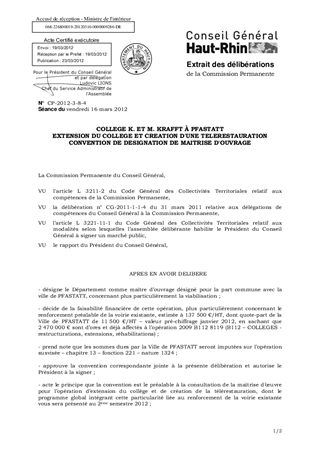 Le présent rapport concerne l’approbation de la convention de désignation de maîtrise d’ouvrage au profit du Département dans le cadre de la viabilisation inhérente à l’opération d’extension du collège et de création d’une télérestauration au collège Katia et Maurice KRAFFT à PFASTATT. La quote-part de la Ville s’élèverait au stade du pré-programme à 11 500 €/HT.