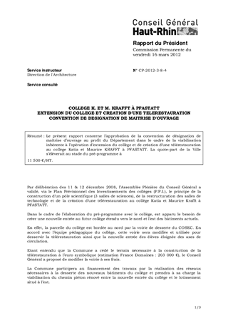 COLLEGE K. ET M. KRAFFT À PFASTATT EXTENSION DU COLLEGE ET CREATION D'UNE TELERESTAURATION CONVENTION DE DESIGNATION DE MAITRISE D'OUVRAGE