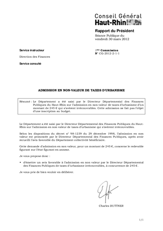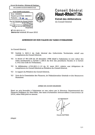 Le Département a été saisi par le Directeur Départemental des Finances Publiques du Haut-Rhin sur l’admission en non valeur de taxes d’urbanisme d’un montant de 245 € qui s’avèrent irrécouvrables. Cette admission ne fait pas l’objet d’une inscription au budget.