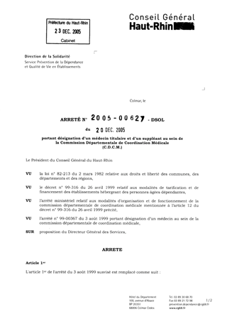 portant désignation d'un médecin titulaire et d'un suppléant au sein de la Commission Départementale de Coordination Médicale (C.D.C.M.). Resumé Pièces jointes ARRETE Assemblée : Non défini Date : 20/12/2005 Rapporteur : Non défini Collectivité : Conseil départemental du Haut-Rhin Direction : Non défini Service : Service de Prévention de la Dépendance Domaine : Autres (non classés) Commission :