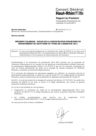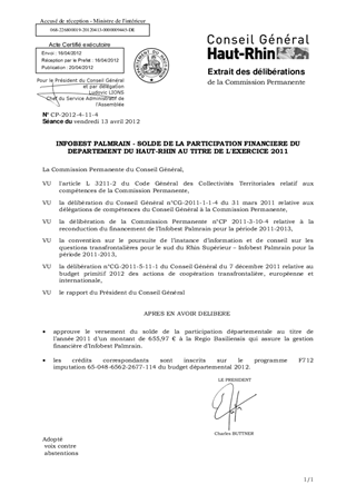 INFOBEST PALMRAIN - SOLDE DE LA PARTICIPATION FINANCIERE DU DEPARTEMENT DU HAUT-RHIN AU TITRE DE L'EXERCICE 2011