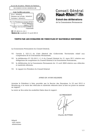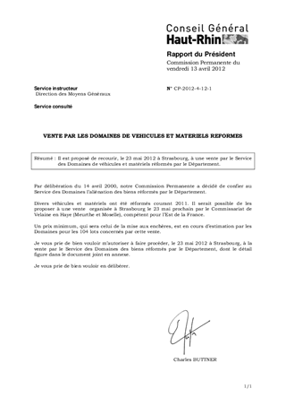 Il est proposé de recourir, le 23 mai 2012 à Strasbourg, à une vente par le Service des Domaines de véhicules et matériels réformés par le Département.