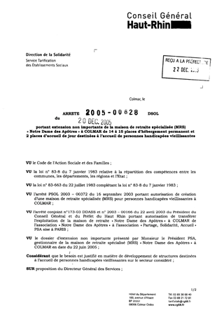 portant extension non importante de la maison de retraite spécialisée (MRS) "Notre Dame des Apôtres" à Colmar de 14 à 15 places d'hébergement permanent et 2 places d'accueil de jour destinées à l'accueil des personnes handicapées vieillissantes. Resumé Pièces jointes ARRETE Assemblée : Non défini Date : 20/12/2005 Rapporteur : Non défini Collectivité : Conseil départemental du Haut-Rhin Direction : Non défini Service : Service de la Tarification des Etablissements Domaine : Autres (non classés) Commission :