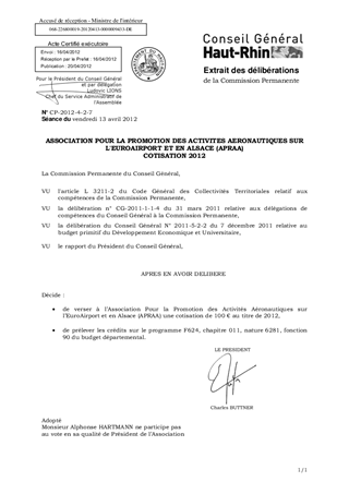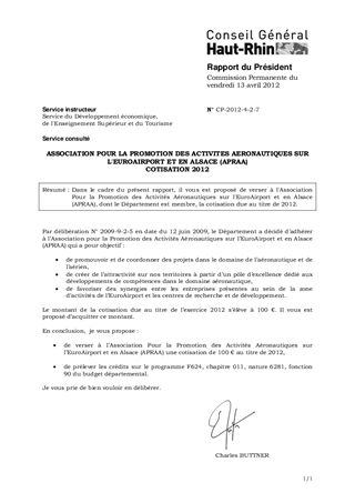 Dans le cadre du présent rapport, il vous est proposé de verser à l'Association Pour la Promotion des Activités Aéronautiques sur l'EuroAirport et en Alsace (APRAA), dont le Département est membre, la cotisation due au titre de 2012.