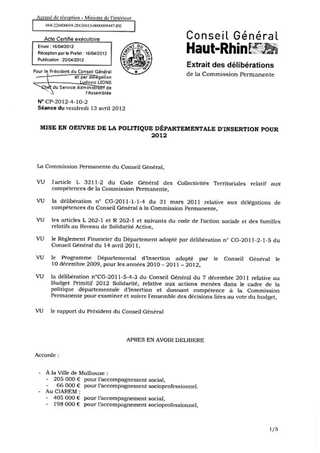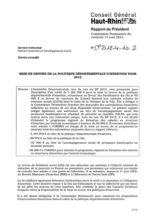 MISE EN OEUVRE DE LA POLITIQUE DEPARTEMENTALE D'INSERTION POUR 2012 Resumé Pièces jointes DELIBERATION RAPPORT Assemblée : Commission Permanente Date : 13/04/2012 Rapporteur : Non défini Collectivité : Conseil départemental du Haut-Rhin Direction : Non défini Service : Service Insertion et Développement Local Domaine : Social / Solidarité Commission : Commission Permanente