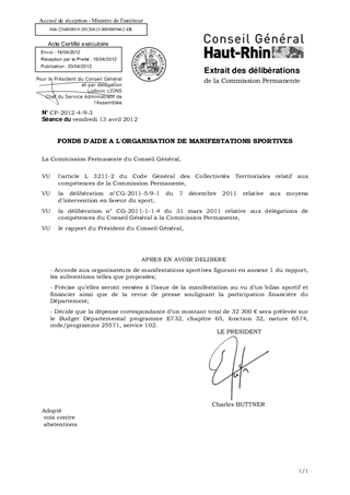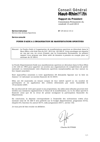 Le Fonds d'aide à l'organisation de manifestations sportives se déroulant dans le Haut-Rhin a été doté lors du B.P. 2012 de 140 000 €. Cette enveloppe est répartie au cas par cas, en cours d'année, par la Commission Permanente. Le présent rapport vous propose une 2ème série de dossiers à prendre en compte pour un montant de 32 300 €.
