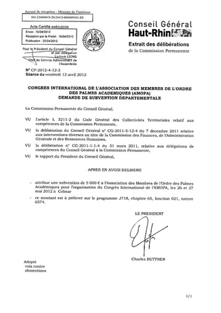 CONGRES INTERNATIONAL DE L'ASSOCIATION DES MEMBRES DE L'ORDRE DES PALMES ACADEMIQUES (AMOPA) DEMANDE DE SUBVENTION DEPARTEMENTALE Resumé Pièces jointes DELIBERATION RAPPORT Assemblée : Commission Permanente Date : 13/04/2012 Rapporteur : Non défini Collectivité : Conseil départemental du Haut-Rhin Direction : Non défini Service : Cabinet Domaine : Administration Commission : Commission Permanente