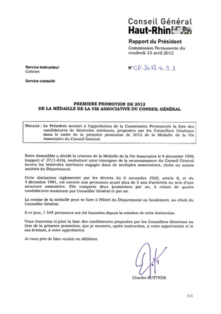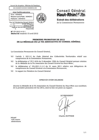 PREMIERE PROMOTION DE 2012 DE LA MEDAILLE DE LA VIE ASSOCIATIVE DU CONSEIL GENERAL Resumé Pièces jointes DELIBERATION RAPPORT Assemblée : Commission Permanente Date : 13/04/2012 Rapporteur : Non défini Collectivité : Conseil départemental du Haut-Rhin Direction : Non défini Service : Cabinet Domaine : Administration Commission : Commission Permanente