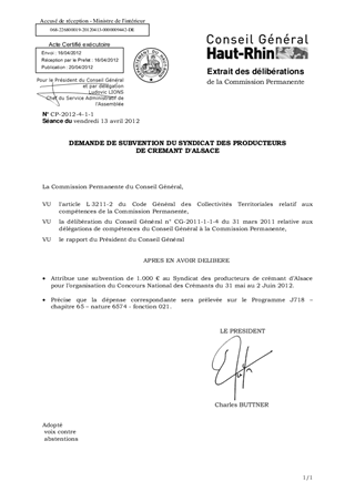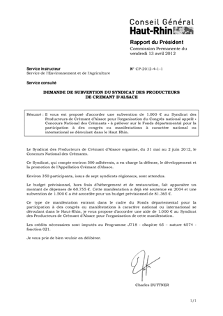 Il vous est proposé d’accorder une subvention de 1.000 € au Syndicat des Producteurs de Crémant d’Alsace pour l’organisation du Congrès national appelé « Concours National des Crémants » à prélever sur le Fonds départemental pour la participation à des congrès ou manifestations à caractère national ou international se déroulant dans le Haut Rhin.