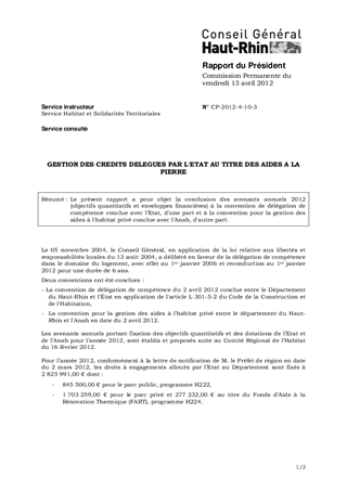 Le présent rapport a pour objet la conclusion des avenants annuels 2012 (objectifs quantitatifs et enveloppes financières) à la convention de délégation de compétence conclue avec l’Etat, d'une part et à la convention pour la gestion des aides à l'habitat privé conclue avec l’Anah, d'autre part.
