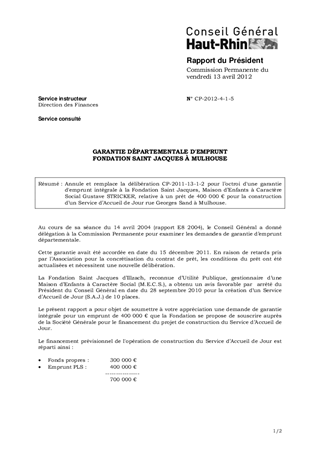 Annule et remplace la délibération CP-2011-13-1-2 pour l’octroi d'une garantie d'emprunt intégrale à la Fondation Saint Jacques, Maison d’Enfants à Caractère Social Gustave STRICKER, relative à un prêt de 400 000 € pour la construction d’un Service d’Accueil de Jour rue Georges Sand à Mulhouse.